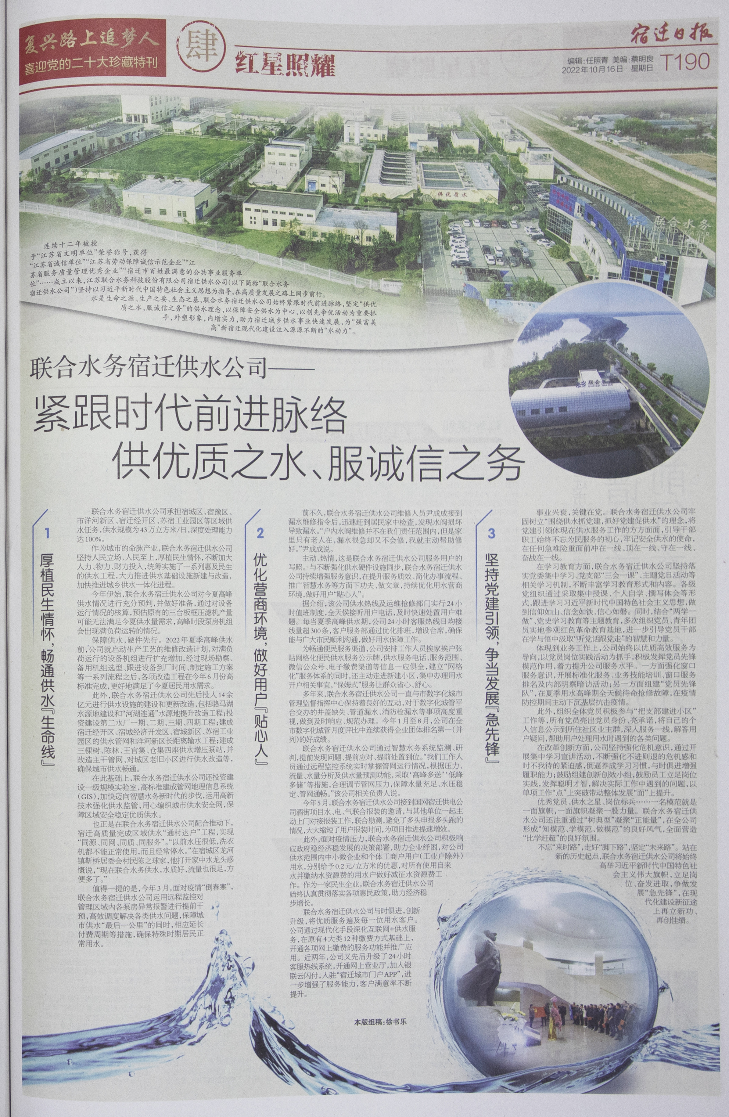 | 江蘇聯合水務科技股份有限公司榮登宿遷日報社喜迎黨的二十大珍藏特刊 | ||