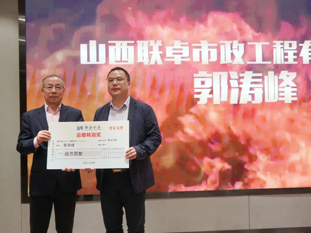 俞總作總結(jié)發(fā)言 會上,俞總向大家分析了當(dāng)前國內(nèi)外經(jīng)濟形勢,分析了行業(yè)趨勢,提出在新的一年,聯(lián)合水務(wù)將開啟新的發(fā)展征程。2023年,我們將面臨新的環(huán)境要求,我們要充分發(fā)揮新的平臺優(yōu)勢,緊緊圍繞“主業(yè)清晰、業(yè)績增長、運營高效”的企業(yè)價值目標,勵精圖治,高質(zhì)量提升存量業(yè)務(wù),切實完成業(yè)績目標,不斷提升管理效率,運營好現(xiàn)有傳統(tǒng)水務(wù)業(yè)務(wù)。同時,要奮發(fā)有為,高質(zhì)量發(fā)展增量業(yè)務(wù),開發(fā)優(yōu)質(zhì)項目和戰(zhàn)略業(yè)務(wù)。我們要聚焦主業(yè),強化科技支撐,輕重業(yè)務(wù)結(jié)合,國內(nèi)與海外發(fā)展;我們也將研究并審慎評估“水務(wù)+”新興領(lǐng)域,充實業(yè)務(wù)版塊,增強管理團隊。 最后,俞總強調(diào),我們要堅持“團結(jié)、誠信、拼搏、共贏”的企業(yè)精神,在2023年的工作中勵精圖治,奮發(fā)有為,為開啟聯(lián)合水務(wù)發(fā)展新征程、實現(xiàn)聯(lián)合水務(wù)高質(zhì)量發(fā)展而努力奮斗。 會議為建設(shè)管理中心副總經(jīng)理兼任山西聯(lián)卓市政工程有限公司總經(jīng)理郭濤峰頒發(fā)了“2022年度總裁特別獎”。2022年,郭總兢兢業(yè)業(yè)、勤懇奉獻,率領(lǐng)聯(lián)卓公司建設(shè)團隊出色完成了業(yè)績?nèi)蝿?wù),為提升聯(lián)合水務(wù)經(jīng)營業(yè)績和項目建設(shè)做出了貢獻。